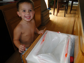 Have I mentioned that he's been climbing everywhere! If there isn't a stool to boost him up, he will cleverly find something to drag over and help him get his job done. I try my best to shower when he's napping, but if he's not, I lock him in the bathroom with me. One day last week, he boosted himself up on the toy container onto the toilet. It was there that I busted him trying to lift himself up onto either the toilet tank or countertop, I forget. I couldn't believe my eyes! He's also figured out how to open the gate at the bottom of our steps. Now, not only do we have a gate, but we also have an ottoman blocking the gate entrance.